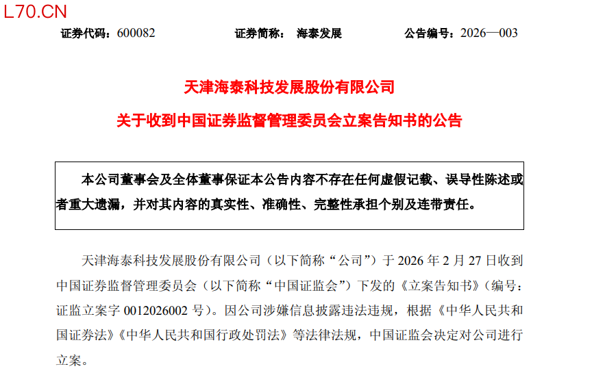 2月27日晚,海泰发展公告,公司当日收到中国证监会下发的《立案告知书》。因公司涉嫌信息披露违法违规,根据《中华人民共和国证券法》《中华人民共和国行政处罚法》等法律法规,中国证监会决定对公司立案。