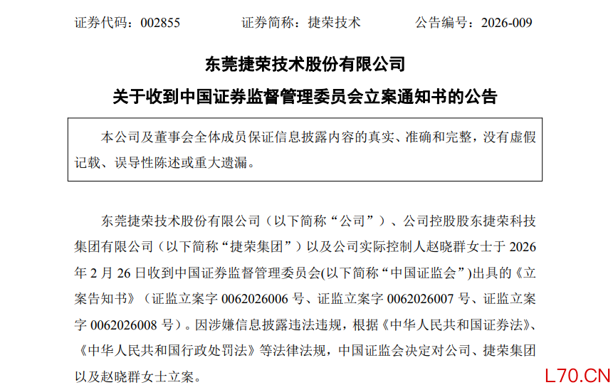 捷荣技术公告称,公司、公司控股股东捷荣科技集团有限公司(以下简称“捷荣集团”)以及公司实际控制人赵晓群于2026年2月26日收到中国证监会出具的《立案告知书》。因涉嫌信息披露违法违规,中国证监会决定对公司、捷荣集团以及赵晓群立案。
