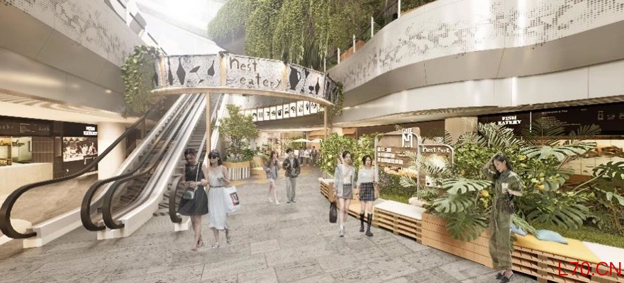 项目以垂直绿化、叠瀑植被柔化工业线条,在1层和B1层公区植入生态造景与休憩设施,将冰冷的科技建筑转变为有温度的公园商业,延伸“城市绿洲”概念。其中B1层以“她,和她的家”为主题,打破柜台式结构,串联花园、客厅、阅读室等场景,把“家”的松弛感融入公共空间,契合女性对归属感、温馨感的追求;同时引入KUDDO COFFEE等定制化轻餐饮品牌,打造生活化美食体验,匹配女性高频次的轻社交、慢生活需求。
