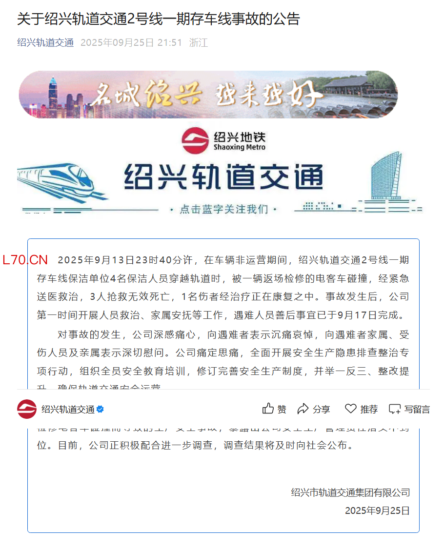 绍兴通报地铁深夜撞人事件:3人抢救无效死亡